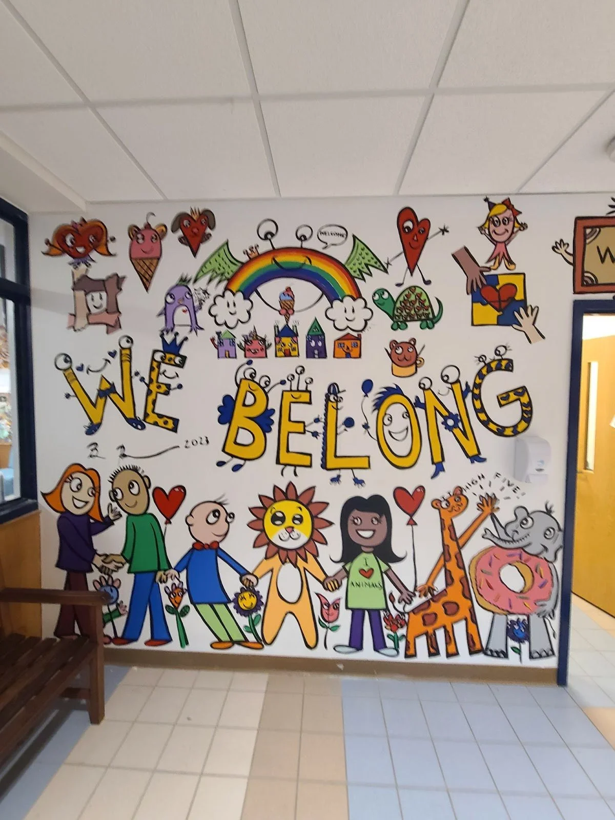 Bren Bataclan’s “pay-it-forward” themed presentation teaches kids the power of kindness. Through his whimsical and happy characters, Bren takes students on a journey around the globe, demonstrating how a smile is universally understood and appreciated. What makes his murals special is that he incorporates students’ ideas and characters in the compositions to make each mural unique and tailored to each school. Bren’s project is about the positive power of art and how the simple gesture of leaving a painting for free can spread joy and laughter. Bren created a beautiful mural at HHS entryway!